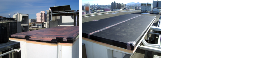 耐久性・伸縮性の高い加硫ゴムのゴムシートを重ね合わせて下地に接着剤で貼り付ける、